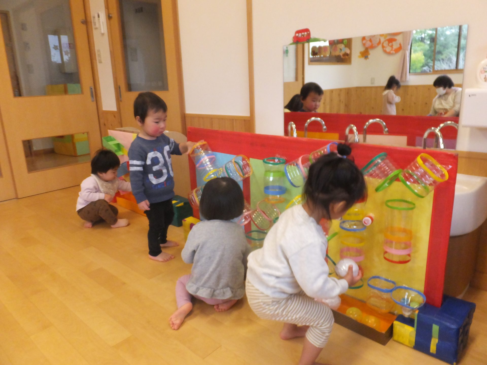 ホールでのお祝いの会の後は…手作りの「コロコロコースター」や「キューブ(紙コップ)パズル」で