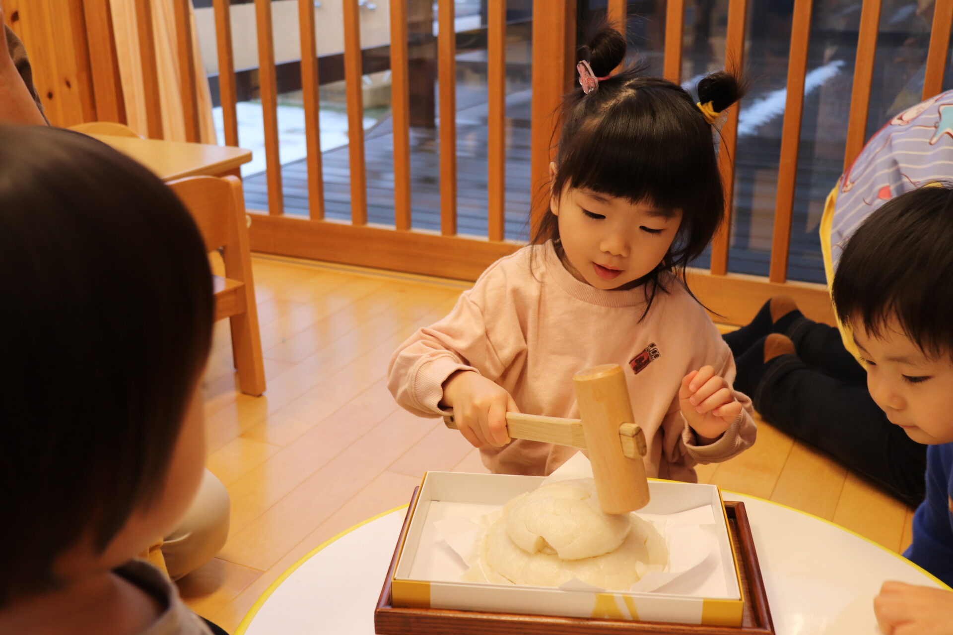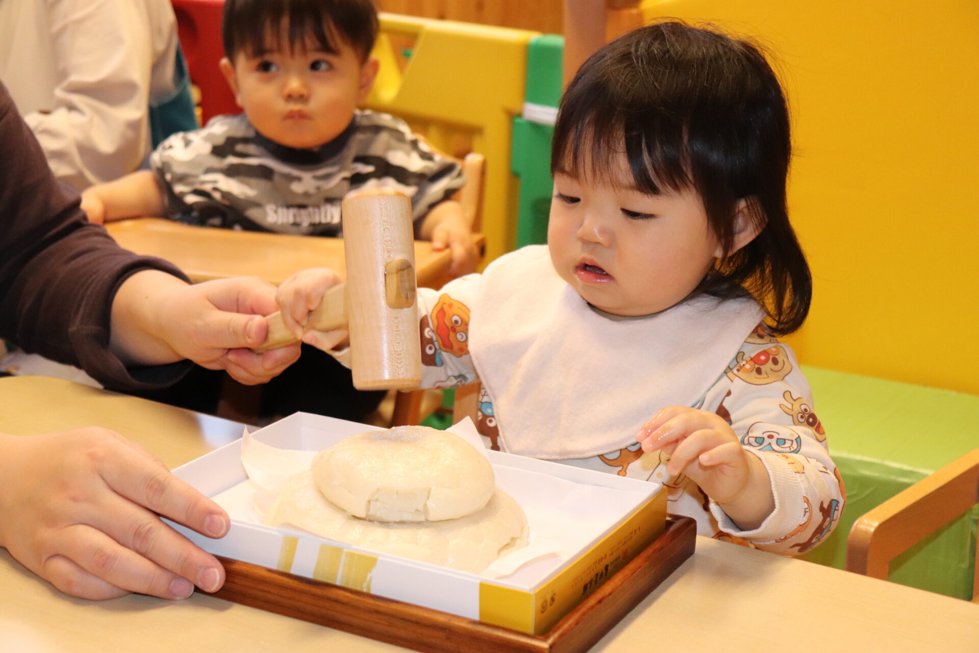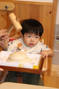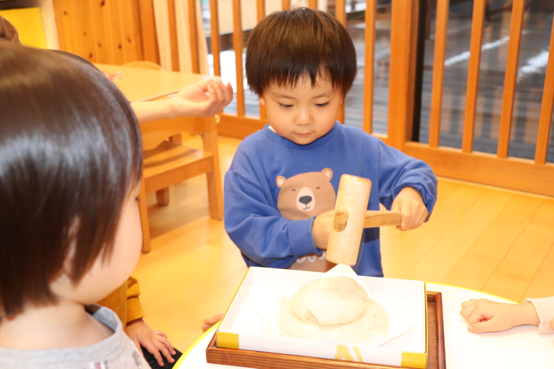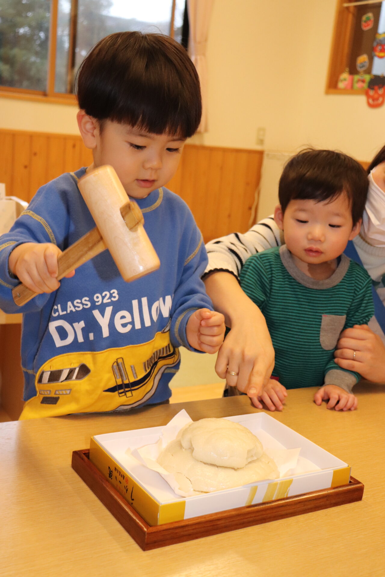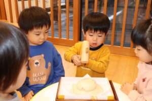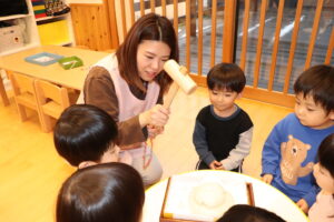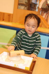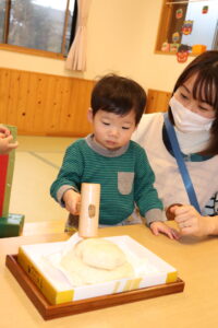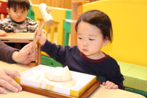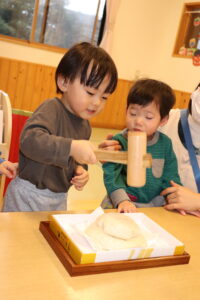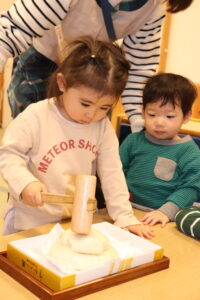 園長先生に教わりながら、小槌を持ちお餅を「トントン…」