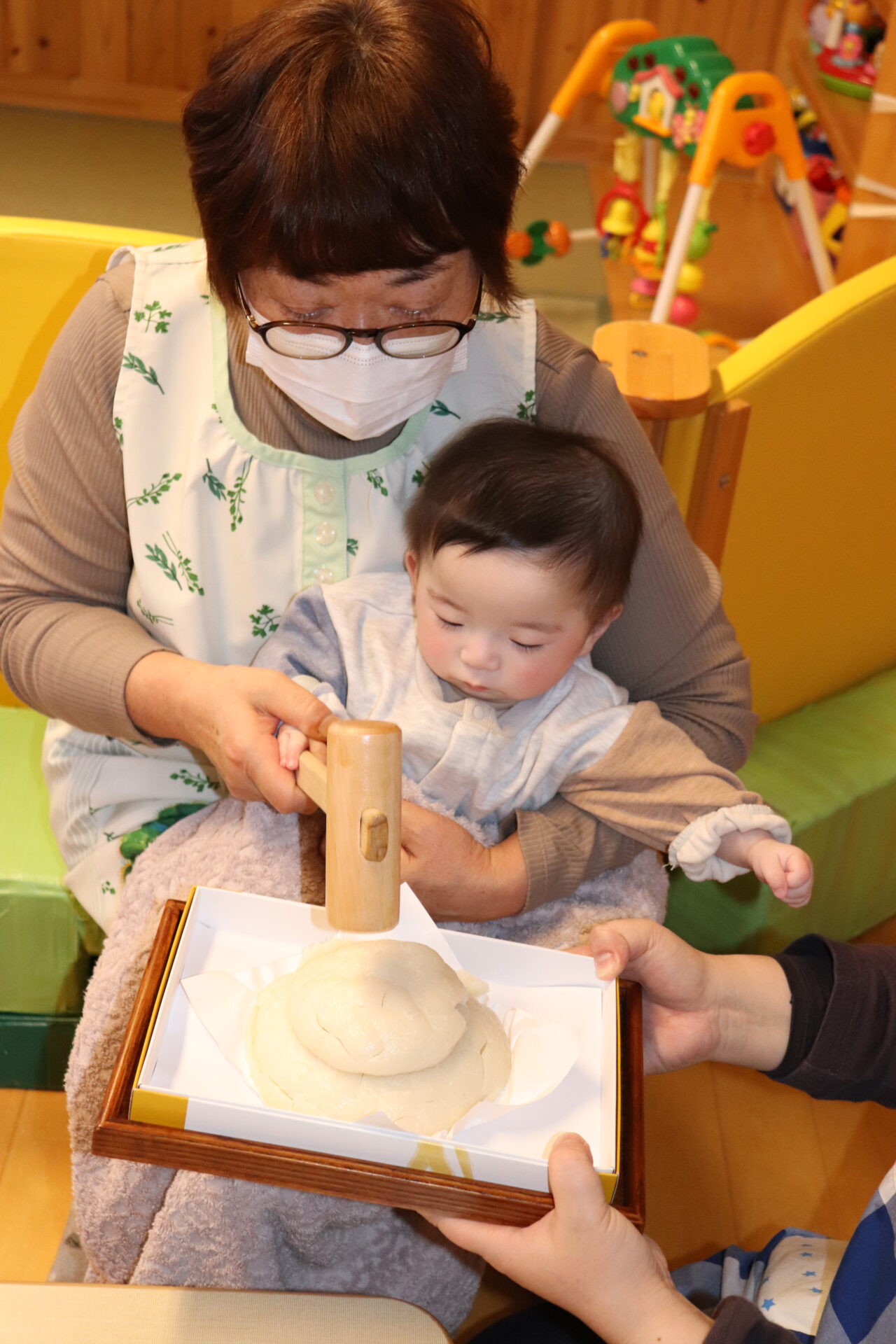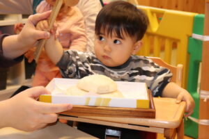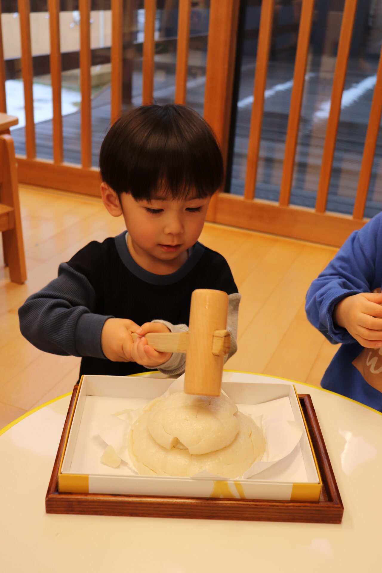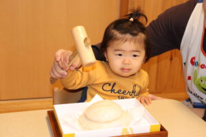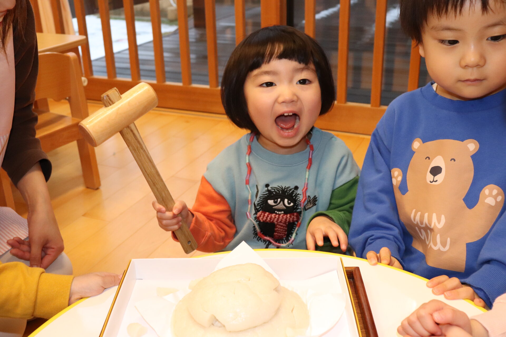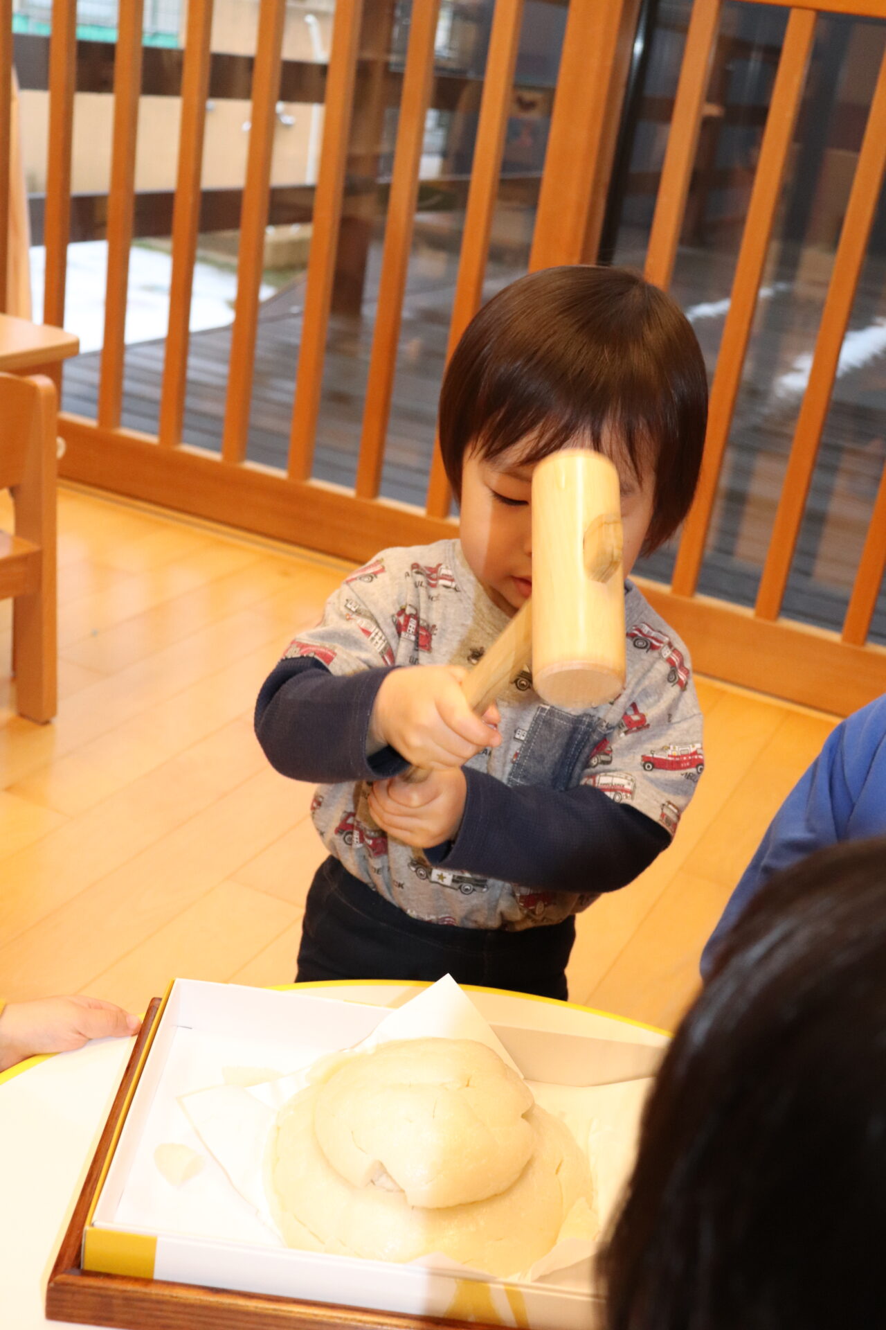 園長先生に教わりながら、小槌を持ちお餅を「トントン…」