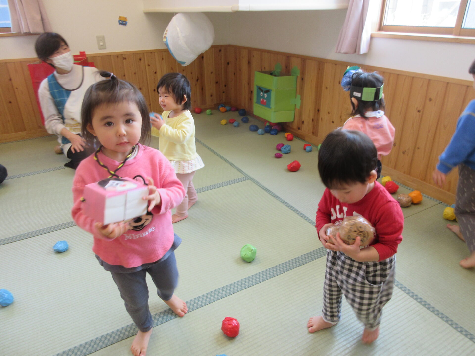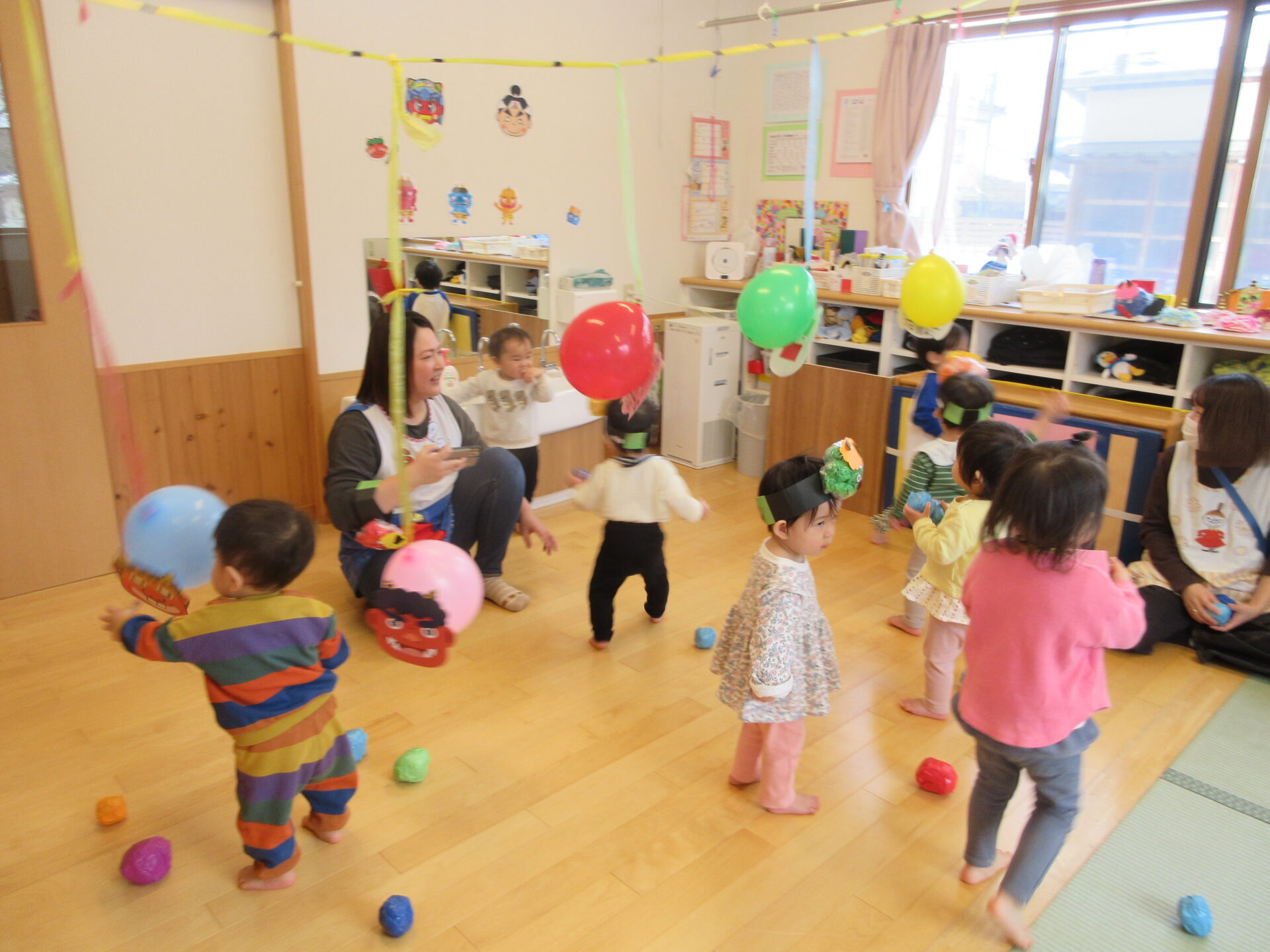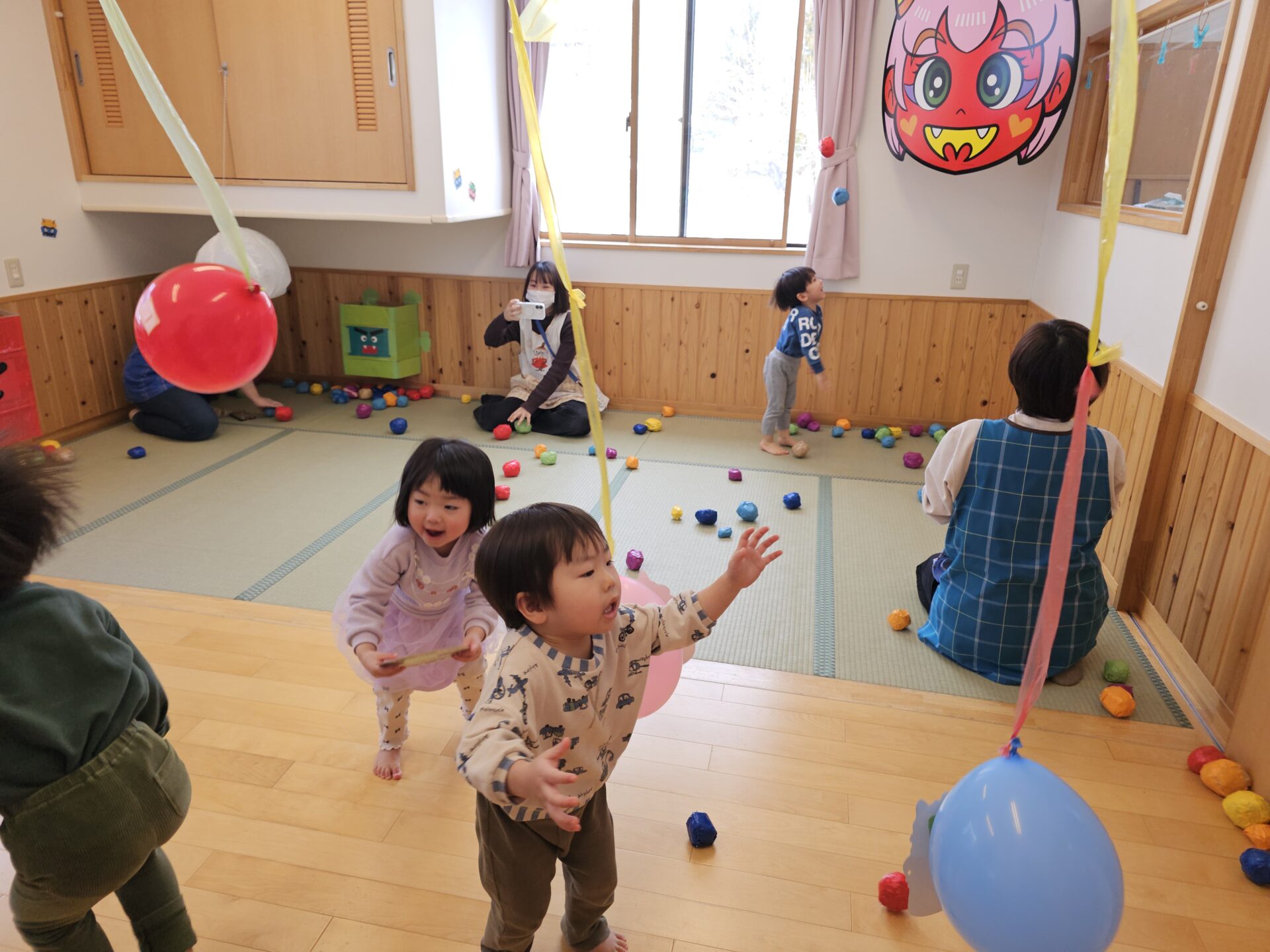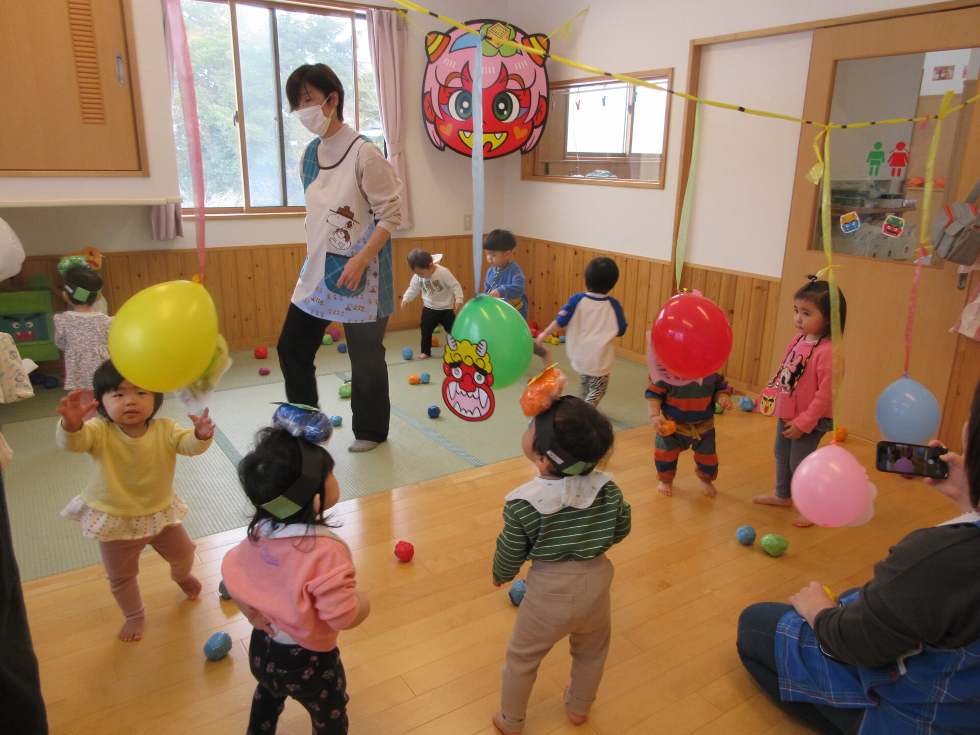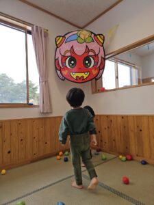 のびのび組は、豆まきゾーン!!大鬼や風船鬼目がけて…